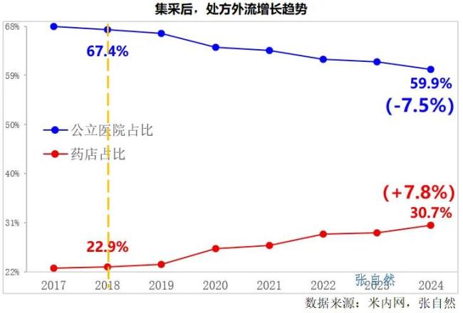 如公立医院的药品采购额在医药终端整体市场规模的占比,由集采之初2018年的67.4%下降到了2024年的59.9%,6年下降了7.5个百分点;