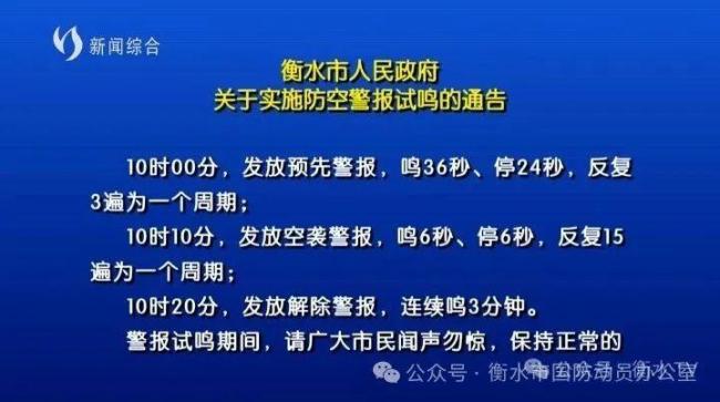 石家庄市人民政府决定于2025年7月7日上午10时00分至10时23分在市区及其他县(市、区)城区组织实施防空警报试鸣活动。此次试鸣将发放预先警报、空袭警报和解除警报三种信号,每种信号各发放一次,间隔7分钟。具体时间为: