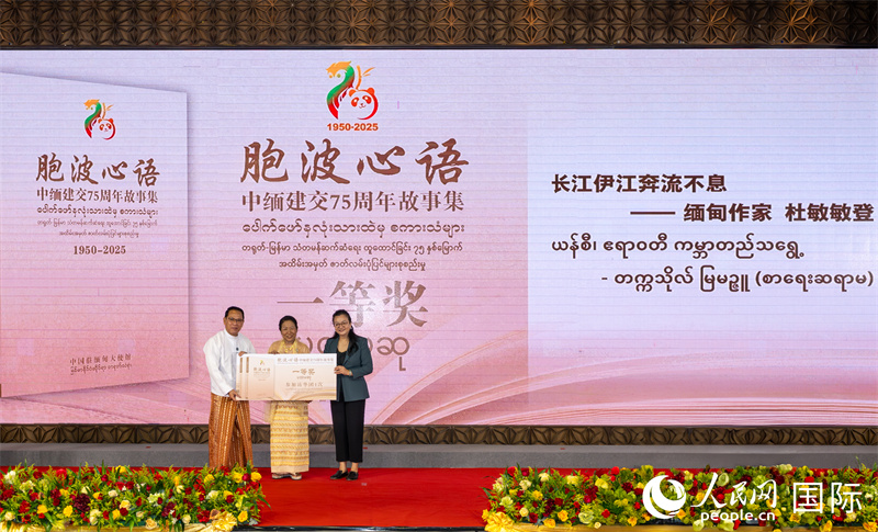 中国驻缅甸大使马珈与缅甸宣传部部长貌貌翁共同为获得一等奖的缅甸作家杜敏敏登颁奖。人民网记者 谢佳君摄