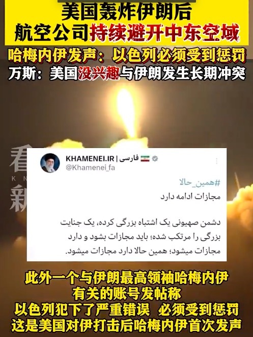 此外,一个与伊朗最高领袖哈梅内伊有关的社交媒体账号当地时间23日在X上发帖称,以色列犯下了严重错误,必须受到惩罚。这是自美国对伊朗进行打击后,哈梅内伊首次发声。