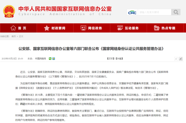 根据六部门联合公布的《国家网络身份认证公共服务管理办法》,国家网络身份认证公共服务平台将于2025年7月15日起正式实施,通过"网号+网证"双轨机制构建可信数字身份体系,实现公民身份信息"可用不可见"的安全目标。
