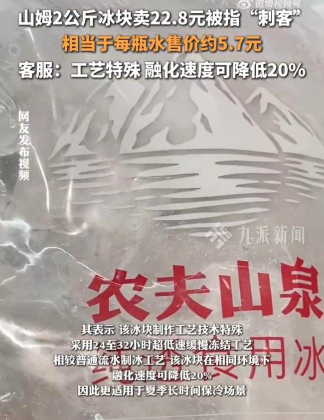 7月7日,山姆客服中心的一名工作人员表示,该产品为农夫山泉专供山姆渠道的定制商品,定价由采购部门与供应商协商确定。这款冰块采用24至32小时超低速缓慢冻结工艺,相比普通流水制冰工艺,在相同环境下融化速度可降低20%,因此更适用于夏季长时间保冷场景。
