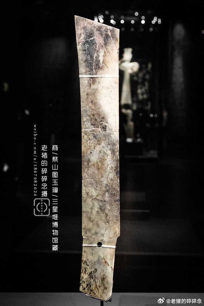 我说当时在三星堆拍摄这件玉璋的时候,上面有明显的拼接修补的痕迹呢,原来是这么回事。这件玉璋之所以珍贵,是因为上面有一幅中国最早的玉器线刻画《祭山图》。这意味着蜀地或为中国绘画的源头。为研究古蜀宗教祭祀礼仪提供了珍贵的资料。图案内容生动刻画了古蜀国原始宗教祭祀场面,反映祭祀神山及神山上神灵,是祭山场面,但又具有图画和纪实的两种原始功能,所以,又可视为罕见的古蜀国巫觋祀山的绘画艺术和图案艺术的有力例证。