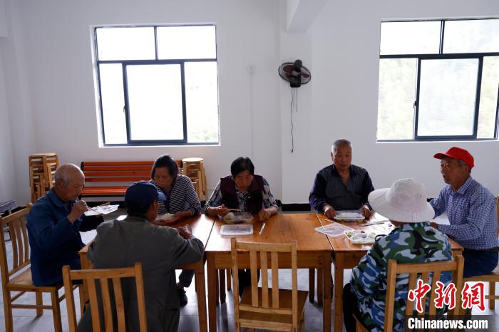 村中老年人在山腰的食堂内享用无人机运来的餐食。肖健 摄