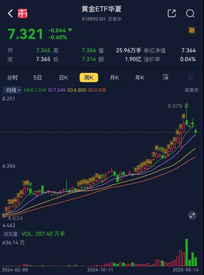 黄金相关ETF纷纷回调,5月12日,黄金ETF华夏(518850.SH)单日跌幅为2.2%。