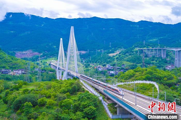 6月27日,首发列车驶过渝厦高铁重庆东至黔江段的一座大桥。(中国铁路成都局集团有限公司供图)