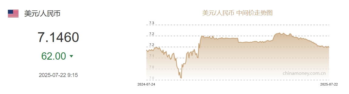 中新网7月22日电 据中国外汇交易中心网站消息,中国人民银行授权中国外汇交易中心公布,2025年7月22日银行间外汇市场人民币汇率中间价为:1美元对人民币7.1460元,上调62个基点。