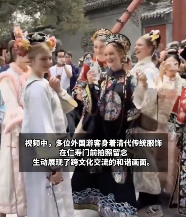 外国游客穿格格装游览颐和园 穿越时空的体验。6月15日,外国游客在颐和园仁寿门前身着清代传统服饰拍照留念。